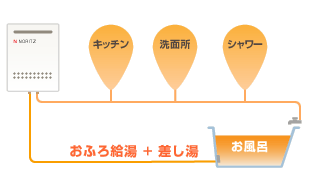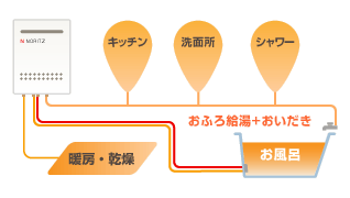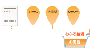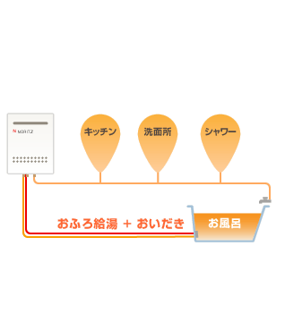 キッチン・洗面所・シャワーなどへの給湯機能に、 おいだき感覚が得られる高温水供給機能を付加したタイプ。