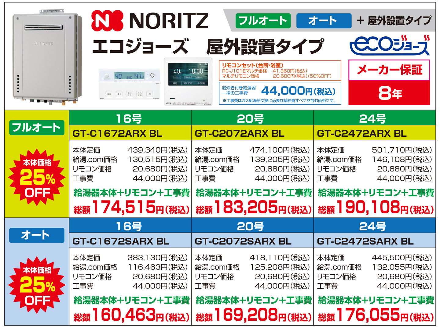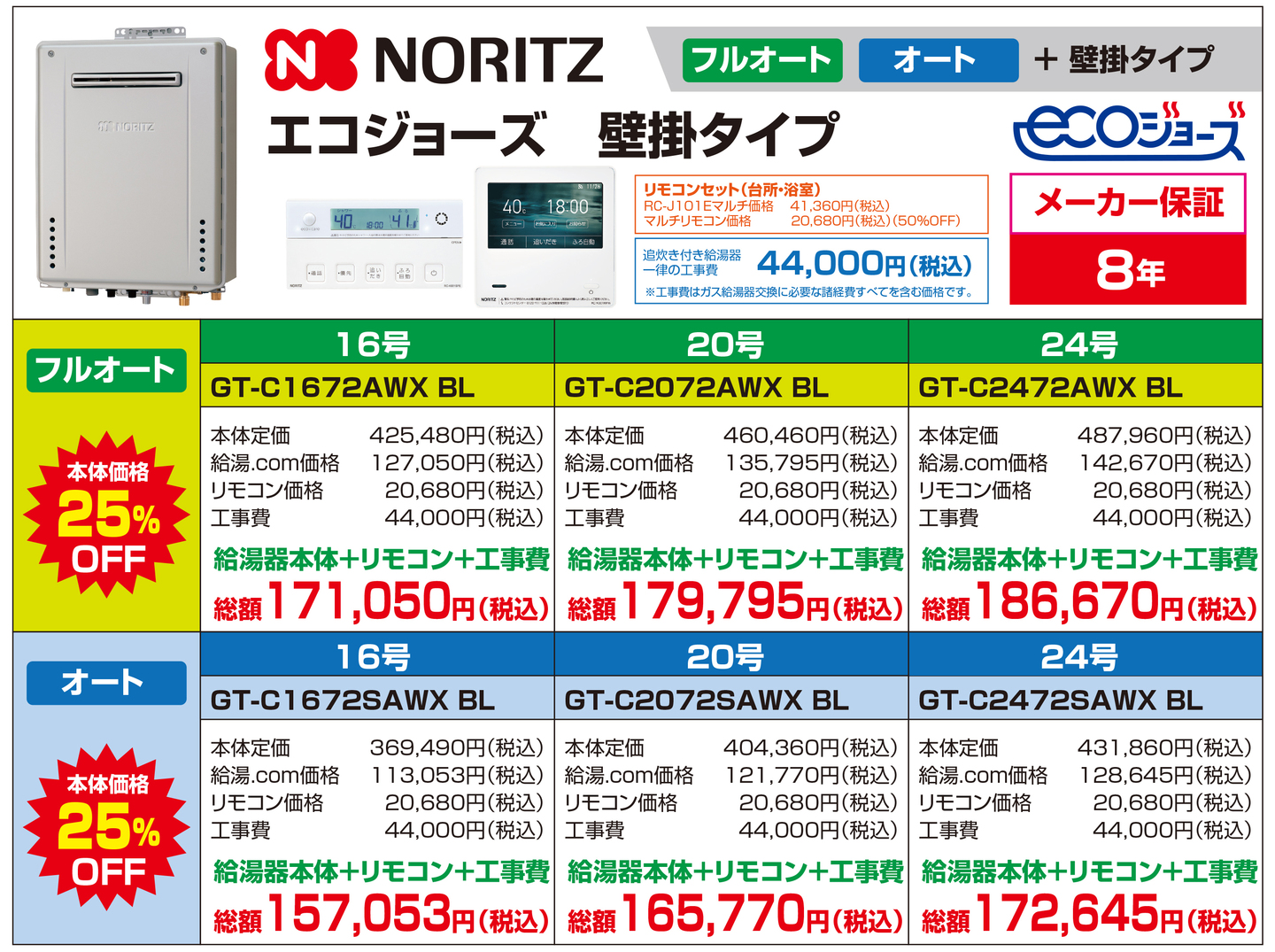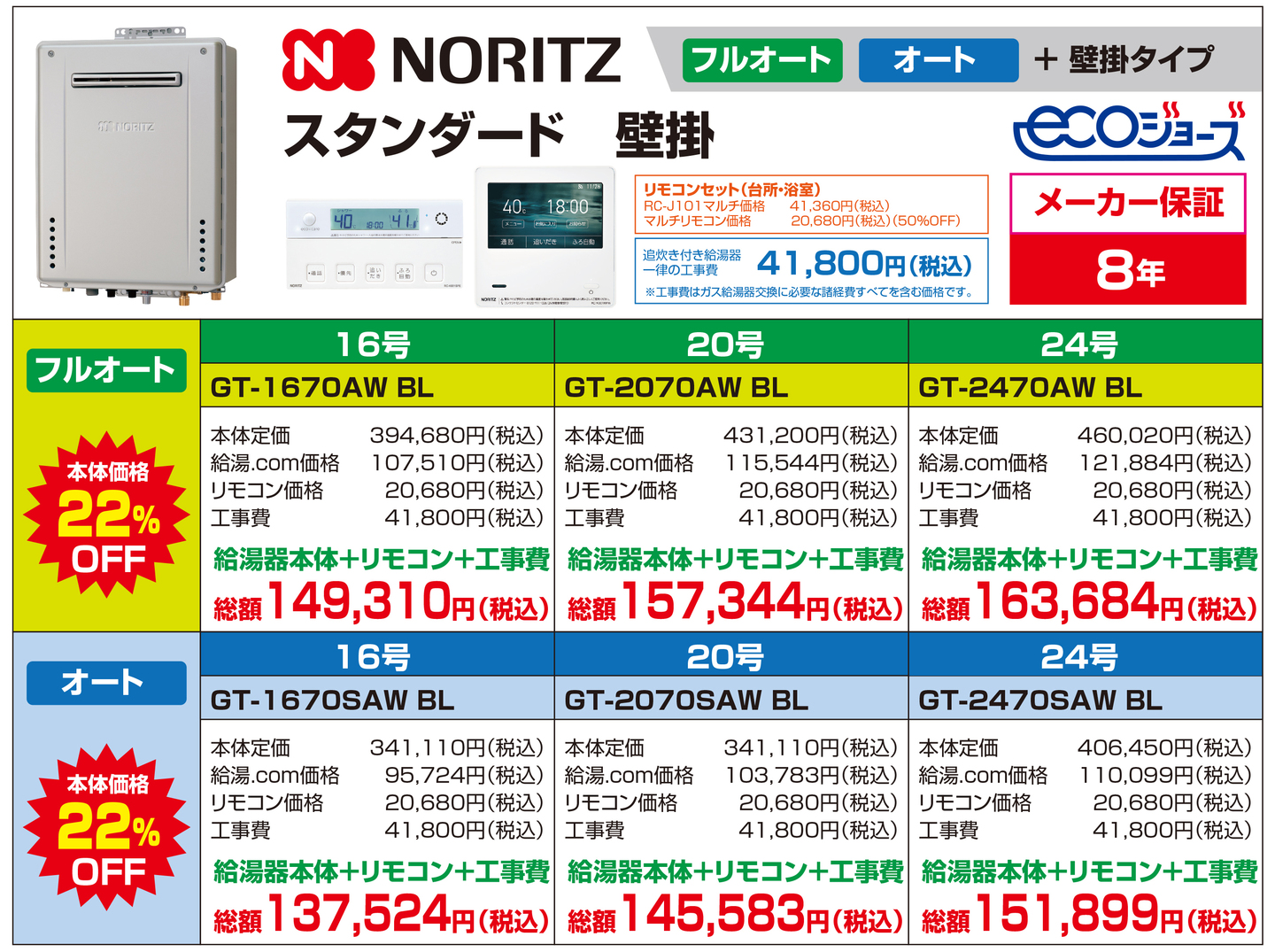 HOME > 商品一覧 > ノーリツ【Noritsu】 Noritsu給湯器(壁掛)価格表 Noritsu給湯器(屋外設置)価格表 Noritsu給湯専用価格表 「リンナイ」「ノーリツ」各メーカーのガス給湯器を取り揃えております。ホームページ未掲載品も数多くご用意しております! 他社でお取り扱いがない給湯器の交換や対応が難しいと断られてしまった工事もお気軽にお問合せください! 全力で対応させていただきます。 まずは、お電話又はお見積りをご依頼ください。 ご相談・お見積りは「無料」です。 詳しくはお電話にてお問合せ下さい。 ファックスでの見積り依頼フォーム 詳しくはお電話にてお問合せ下さい。 ファックスでの見積り依頼フォーム