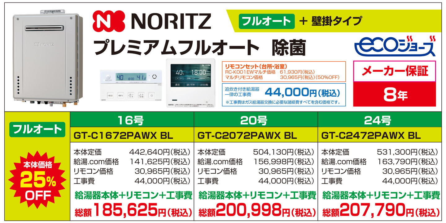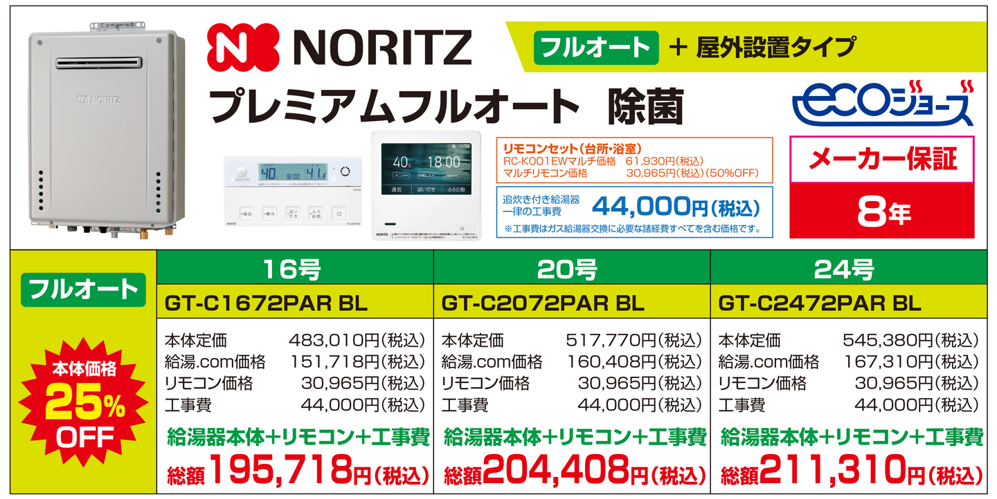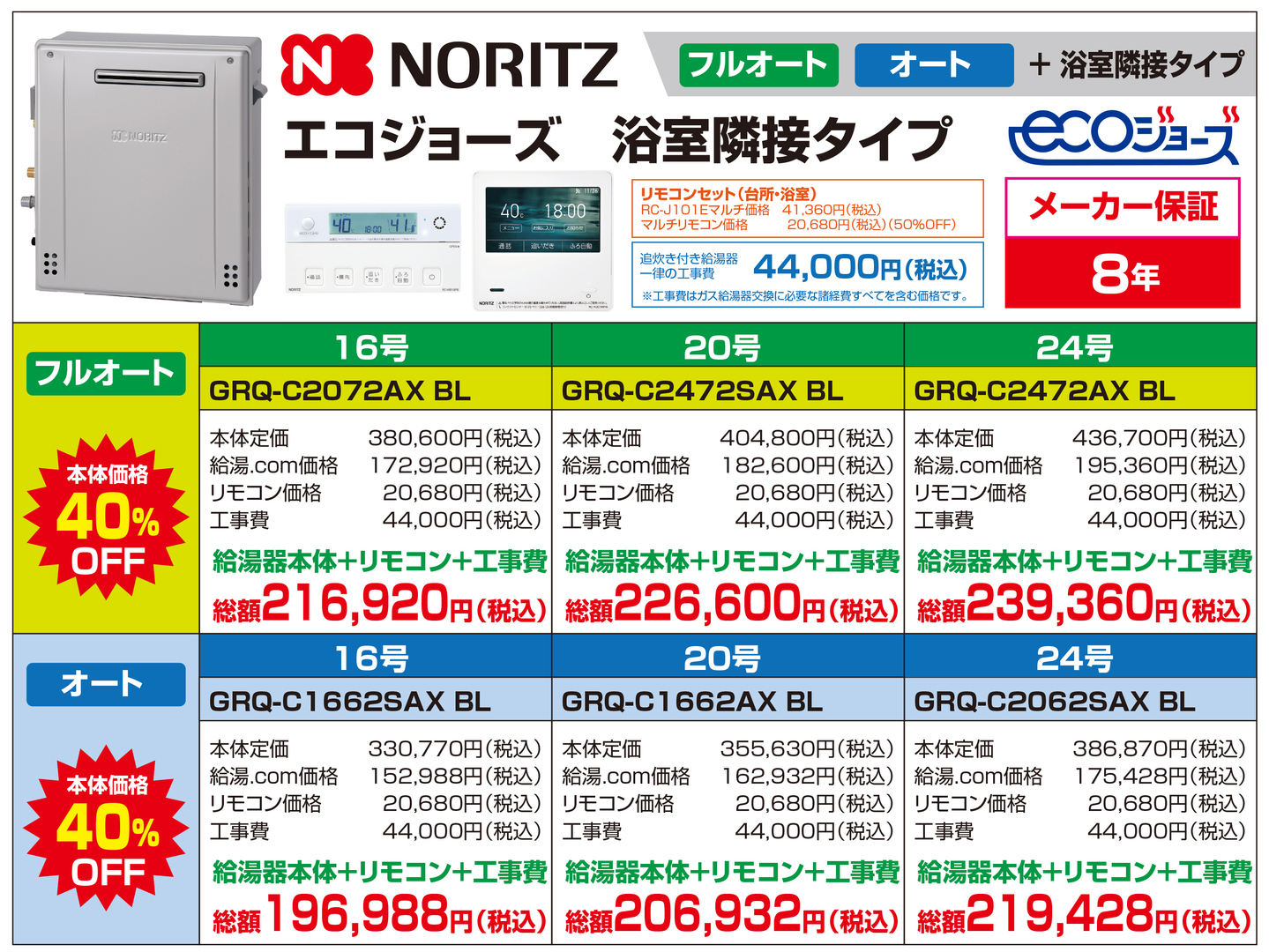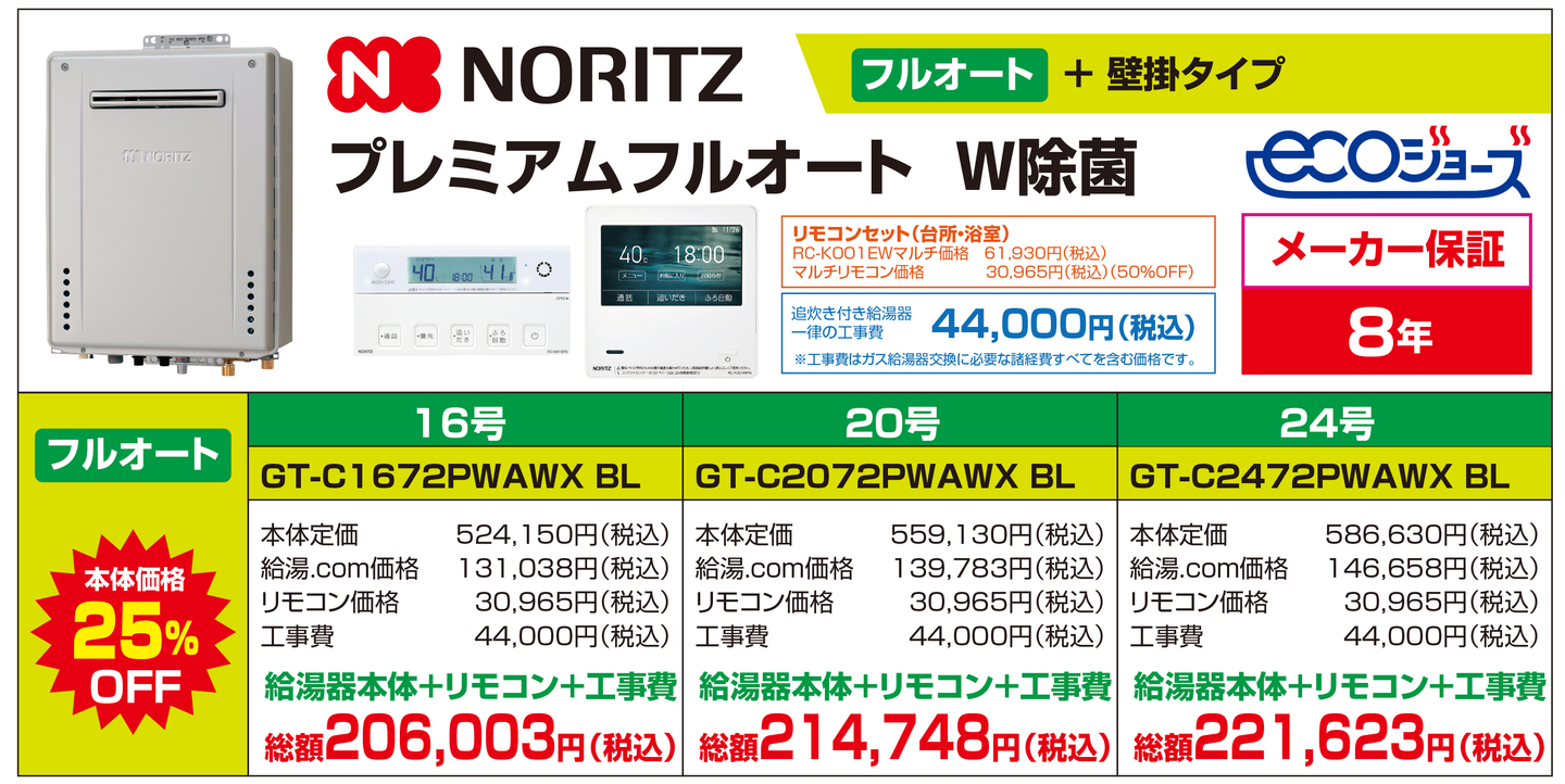 HOME > 商品一覧 > ノーリツ【Noritsu】 Noritsu給湯器(壁掛)価格表 Noritsu給湯器(屋外設置)価格表 Noritsu給湯専用価格表 「リンナイ」「ノーリツ」各メーカーのガス給湯器を取り揃えております。ホームページ未掲載品も数多くご用意しております! 他社でお取り扱いがない給湯器の交換や対応が難しいと断られてしまった工事もお気軽にお問合せください! 全力で対応させていただきます。 まずは、お電話又はお見積りをご依頼ください。 ご相談・お見積りは「無料」です。 詳しくはお電話にてお問合せ下さい。 ファックスでの見積り依頼フォーム 詳しくはお電話にてお問合せ下さい。 ファックスでの見積り依頼フォーム